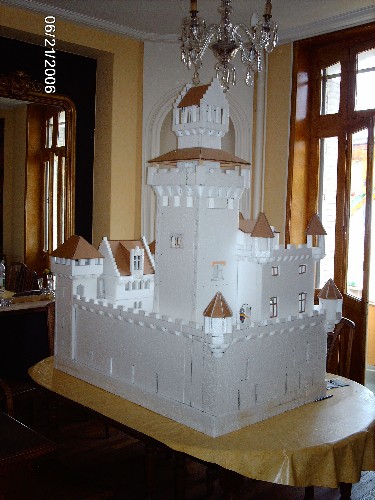 J'ai tenu à ce que le château soit le plus réaliste d'un point de vue architecture et constructif. Le choix du polystyrène s'est avéré intéressant car justement on pouvait jouer avec les épaisseurs. Ainsi, les murs de soubassement sont très épais et l'épaisseur diminue avec la hauteur. Je regrette seulement d'avoir pas eu le temps de rajouter des contreforts (je pense qu'ils viendront plus tard). En effet, le projet durait depuis deux ans et je lui avais promis pour le 15 août dernier. Chose promise, chose due...même au prix de quelques nuits fort courtes...(les architectes appellent cela être "charrette"). |