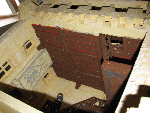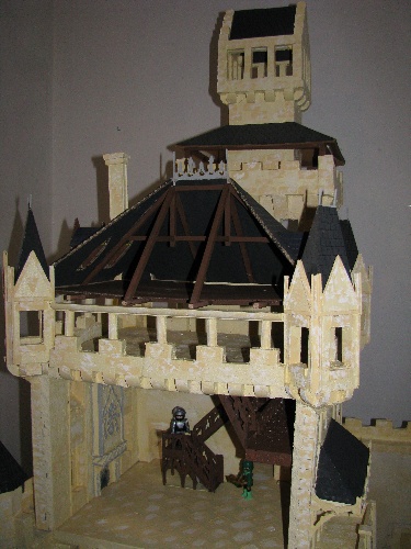 Elle est due au chat des mes amis, Mortimer. En effet, le bâtiment initial comportait deux niveaux séparés par un plancher. Le niveau supérieur ne me convenait pas car, bas de plafond et trop profond, il n'était pas aisé de jouer dedans (l'aisance dans le jeu est un critère essentiel ne serait-ce que pour la survie du château à long terme...). Il n'y avait pas non plus de grande toiture ; seule une grande terrasse pour pouvoir y mettre des canons, encadré par les quatre petites échauguettes.