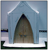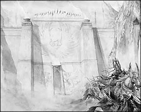 fermée par d'immenses portes de bronze ou faites du