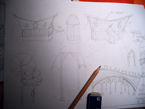 Quelques croquis préparatoires l'ont aidé à s'imprégner de l'architecture elfe.