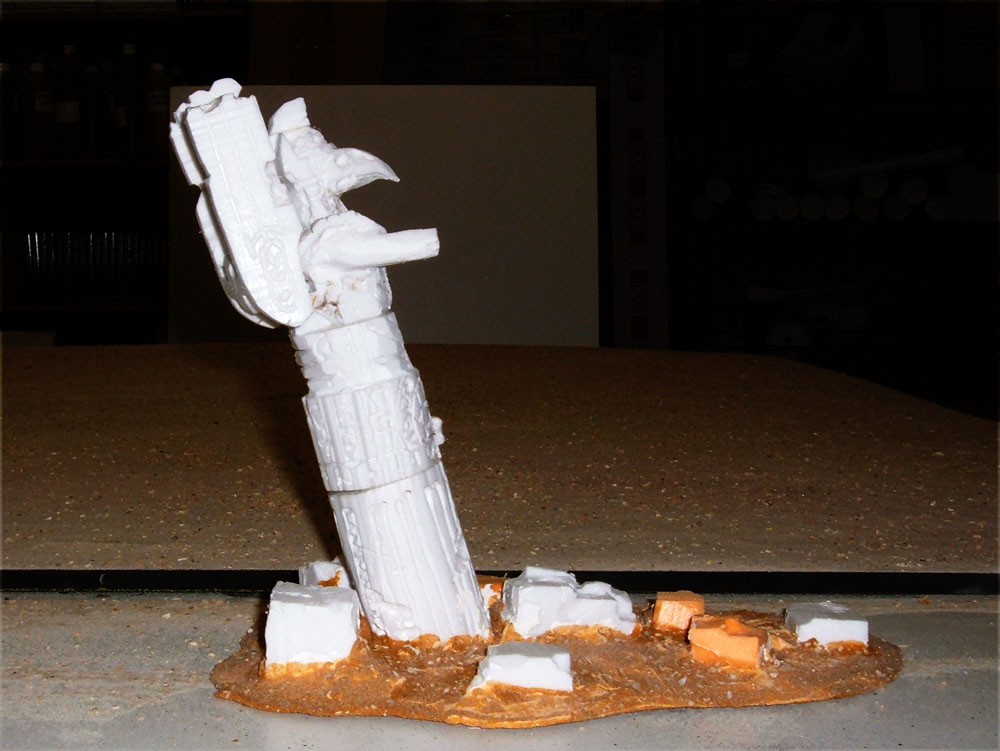 La statue est sculptée dans un bloc de polystyrène extrudé et décorée au pyrograveur. |