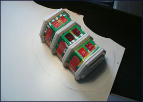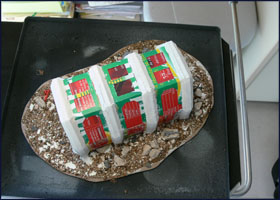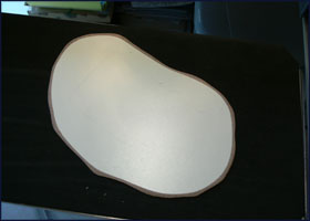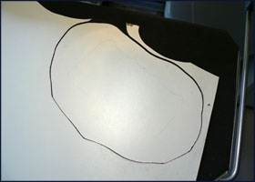 | Découpe et ponçage: Placez votre décor sur une plaque d'Isorel et tracez le contour de votre socle au crayon. A part pour quelques bâtiments urbains, le mieux sera généralement de dessiner un contour arrondi laissant entre 1 et 4 cm autour du décor. |